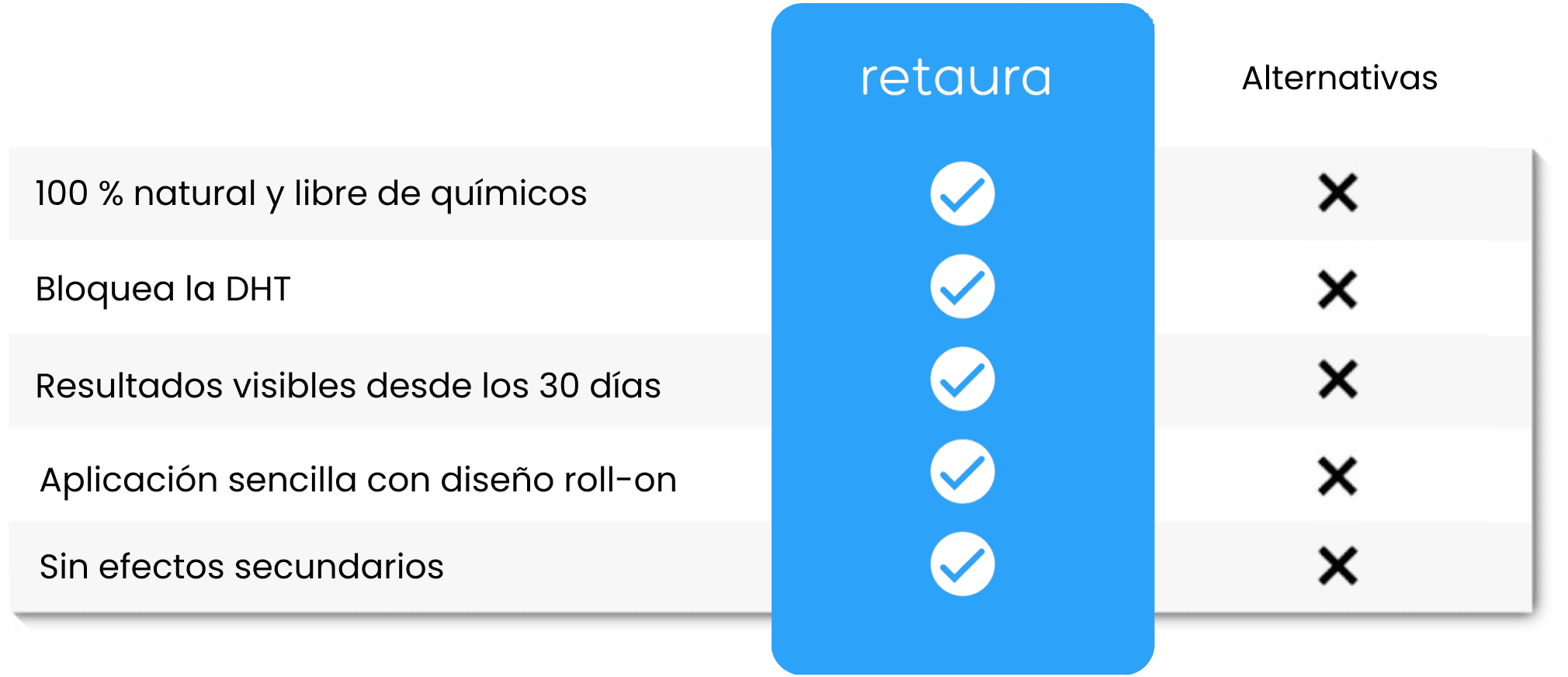 Los tratamientos tradicionales como pastillas, champús o trasplantes son costosos, agresivos o no muestran resultados reales. El Retaura™ Sérum Capilar Roll-On Anticaída funciona de otra manera: científica, segura y eficaz. Bloquea la DHT, la principal causa de la caída del cabello de origen hereditario, y reactiva los folículos inactivos. Mientras otros productos solo lo disimulan, Retaura activa el crecimiento natural de tu propio cabello. Sin efectos secundarios, sin residuos grasos y sin pastillas diarias. Los resultados se notan: cabello más denso, fuerte y saludable, visible desde los 30 días.